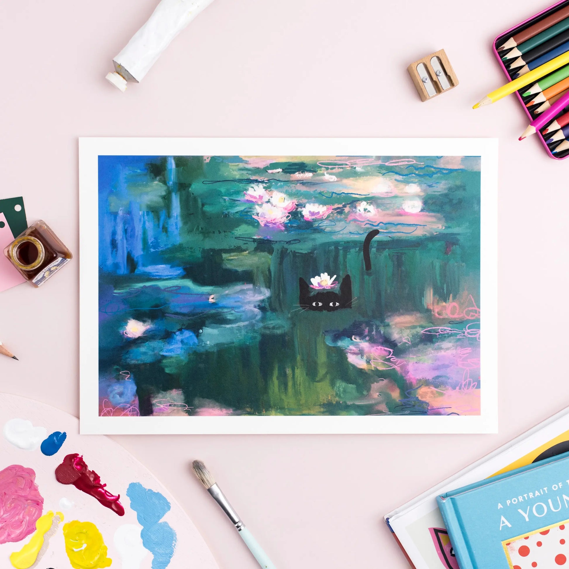 Dies ist die perfekte Wandkunst für Katzen- und Kunstliebhaber. Offensichtlich inspiriert von der Arbeit des Künstlers „Claude Monet“. Dieser Druck gibt eine lustige Interpretation des Kunstwerks „Water Lillies“.