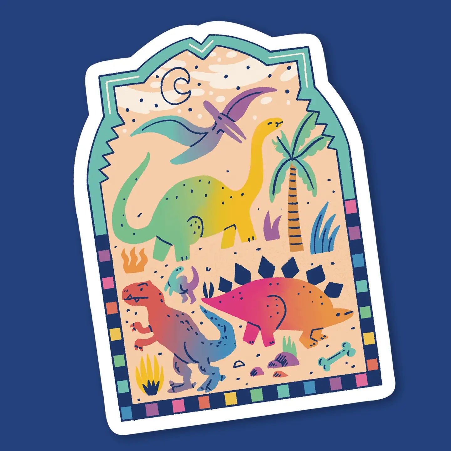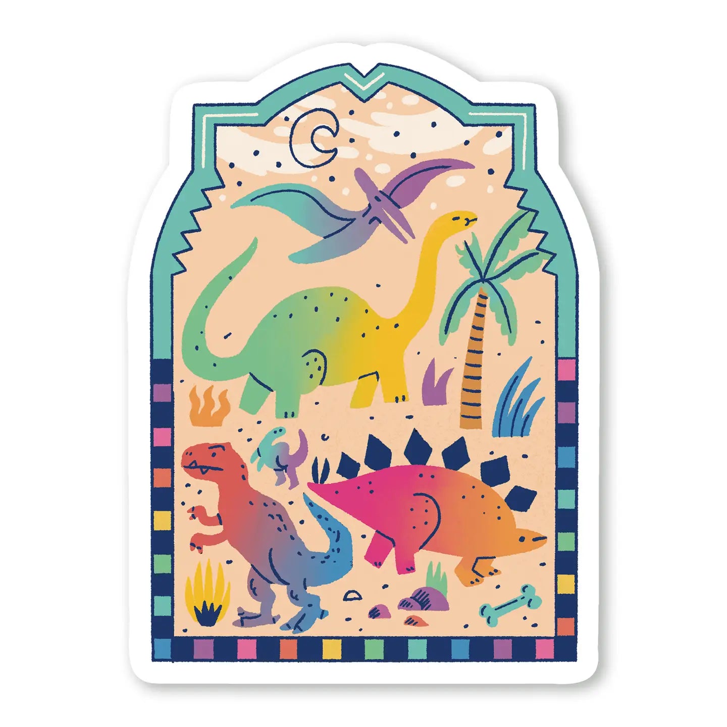 Een leuke sticker van een vrolijke dino bende. Leuk voor op je schetsboek, notitieboek, journal of waterfles!