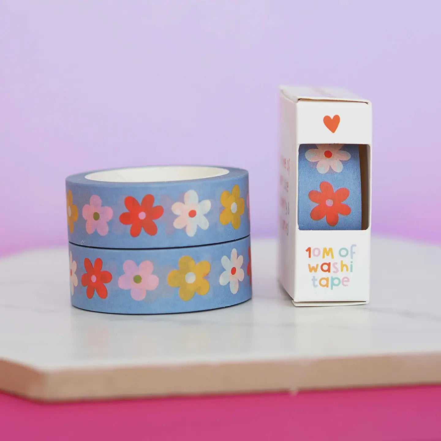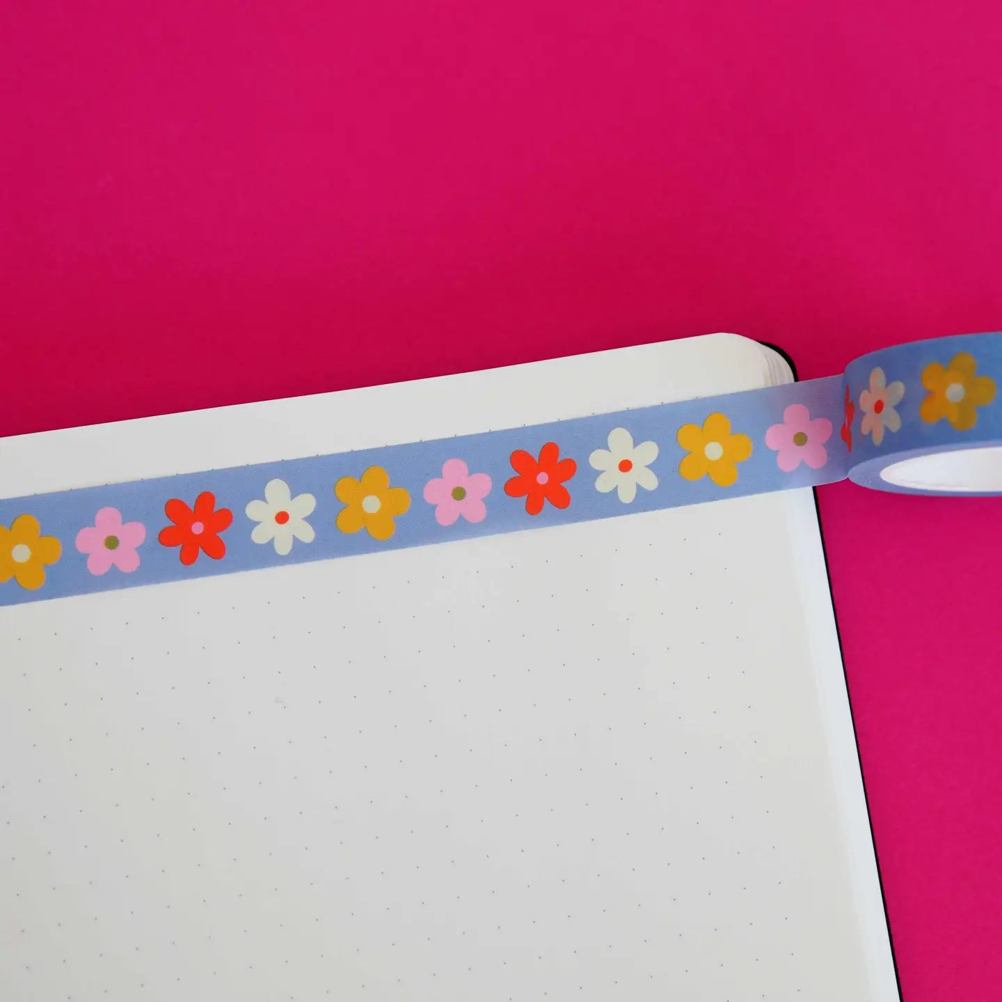 Deze vrolijke blauwe washi tape met kleurrijke bloemetjes is ideaal voor in je schetsboek, journal, notitieboek of planner!