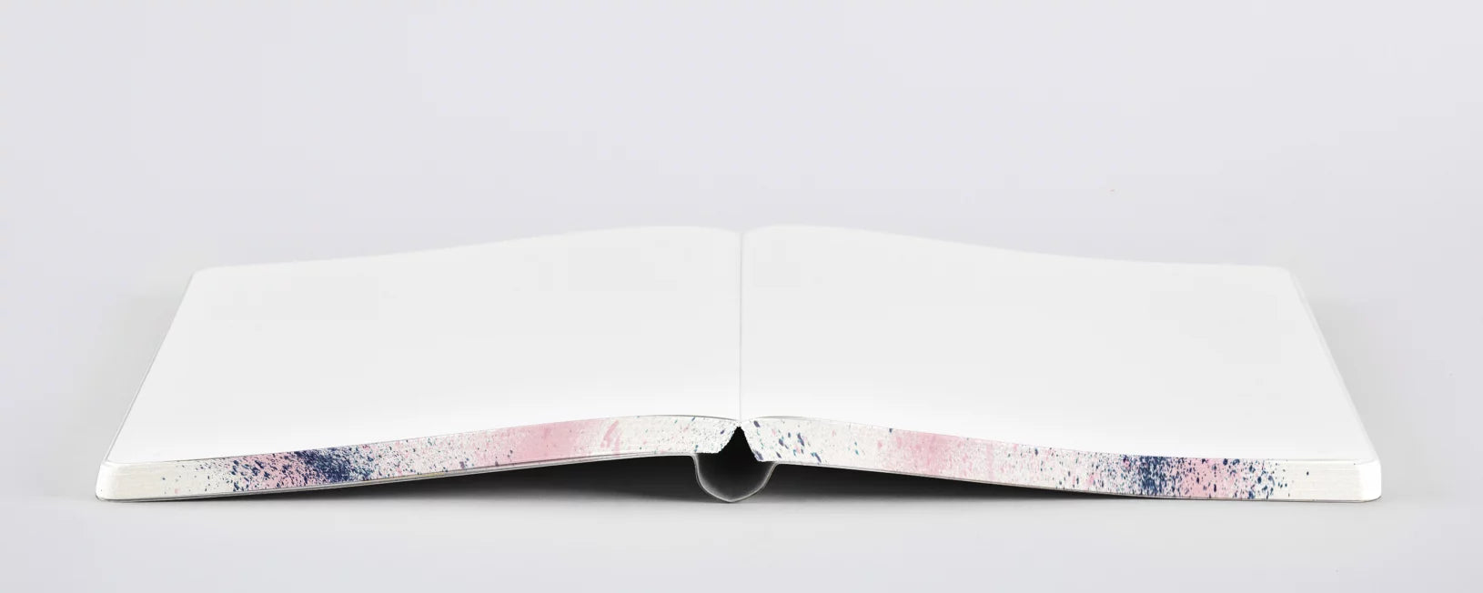 Der Einband ist in Denim-Etikettenmaterial mit Siebdruck von Tintenspritzern gebunden.