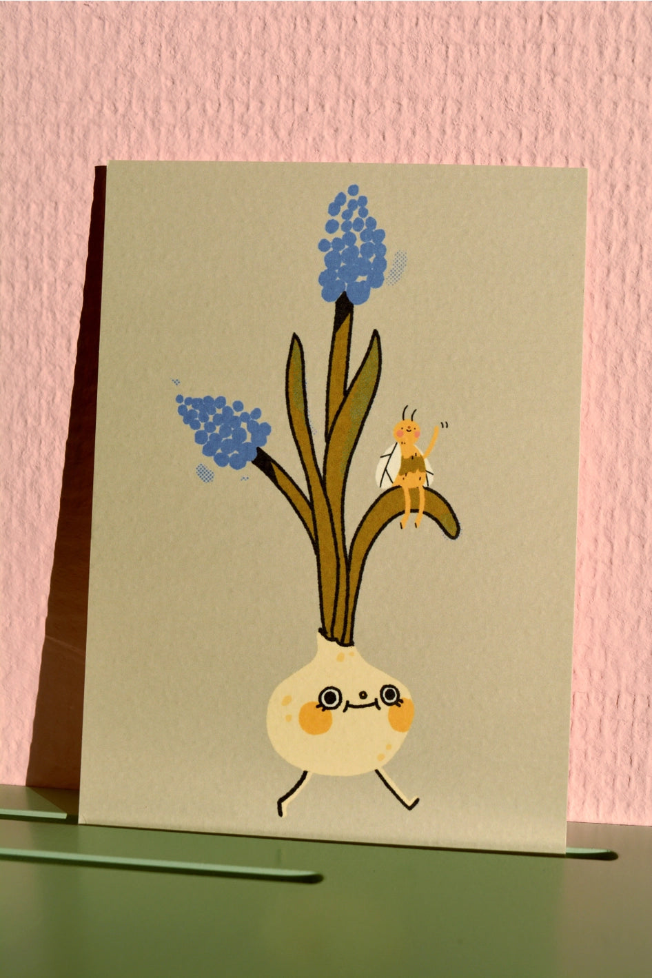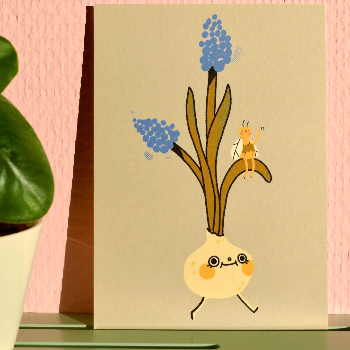 Een schattige wandelende bloembol vergezeld door een kleine hommel 🐝. Verstuur deze vrolijke wenskaart naar vrienden en familie.