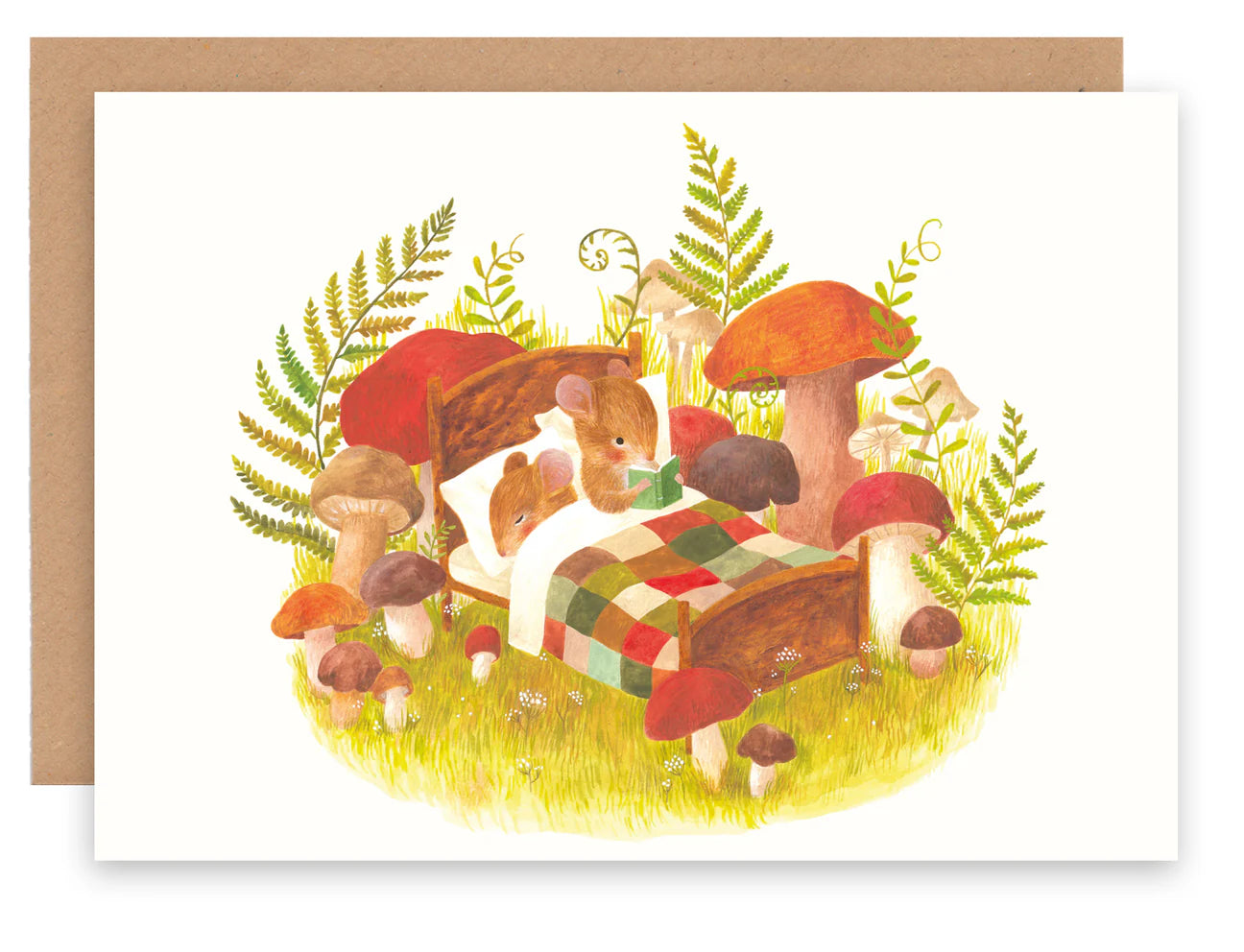 How cute is this autumnal greeting card? It features mice relaxing in a big, soft bed. A greeting card with an open theme; create your own fun one!