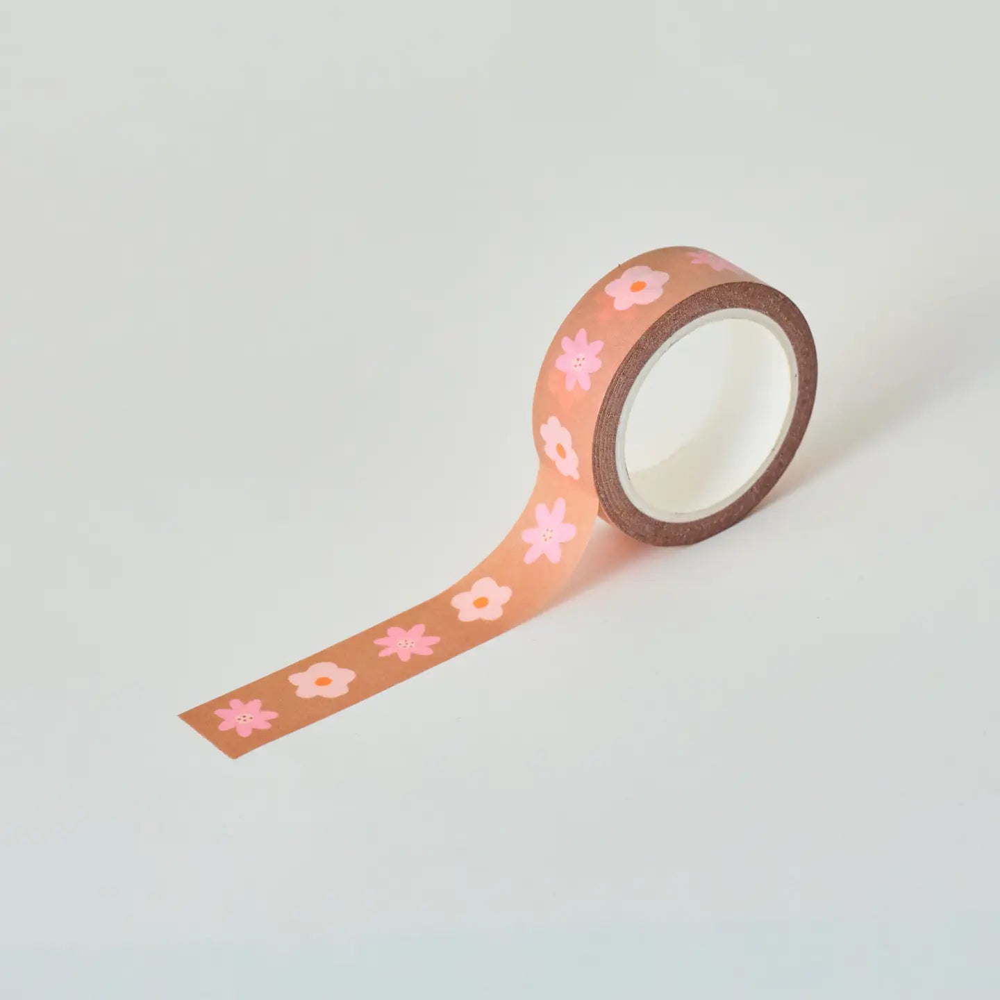Cute washi tape with a brown background and pink flowers. This washi tape is great for brightening up your notebook, sketchbook, planner, bullet journal, or other stationery!