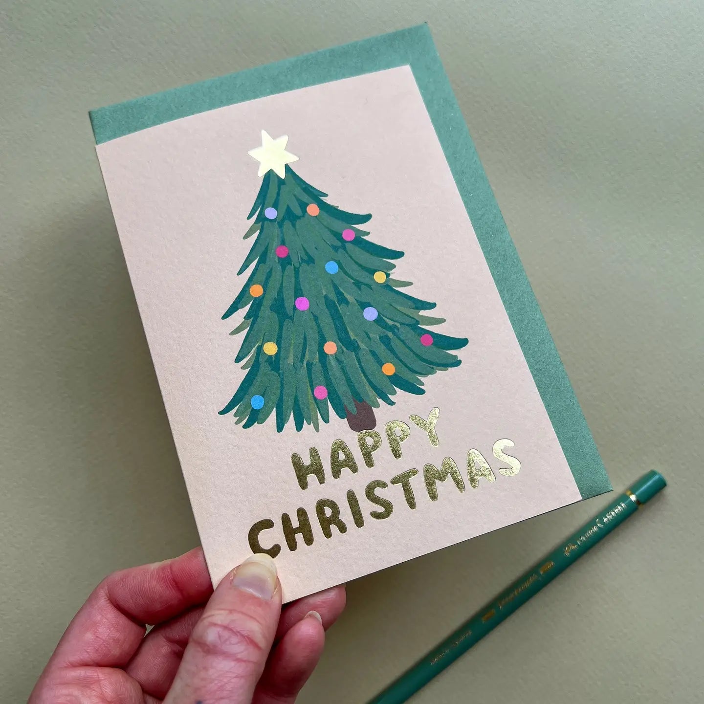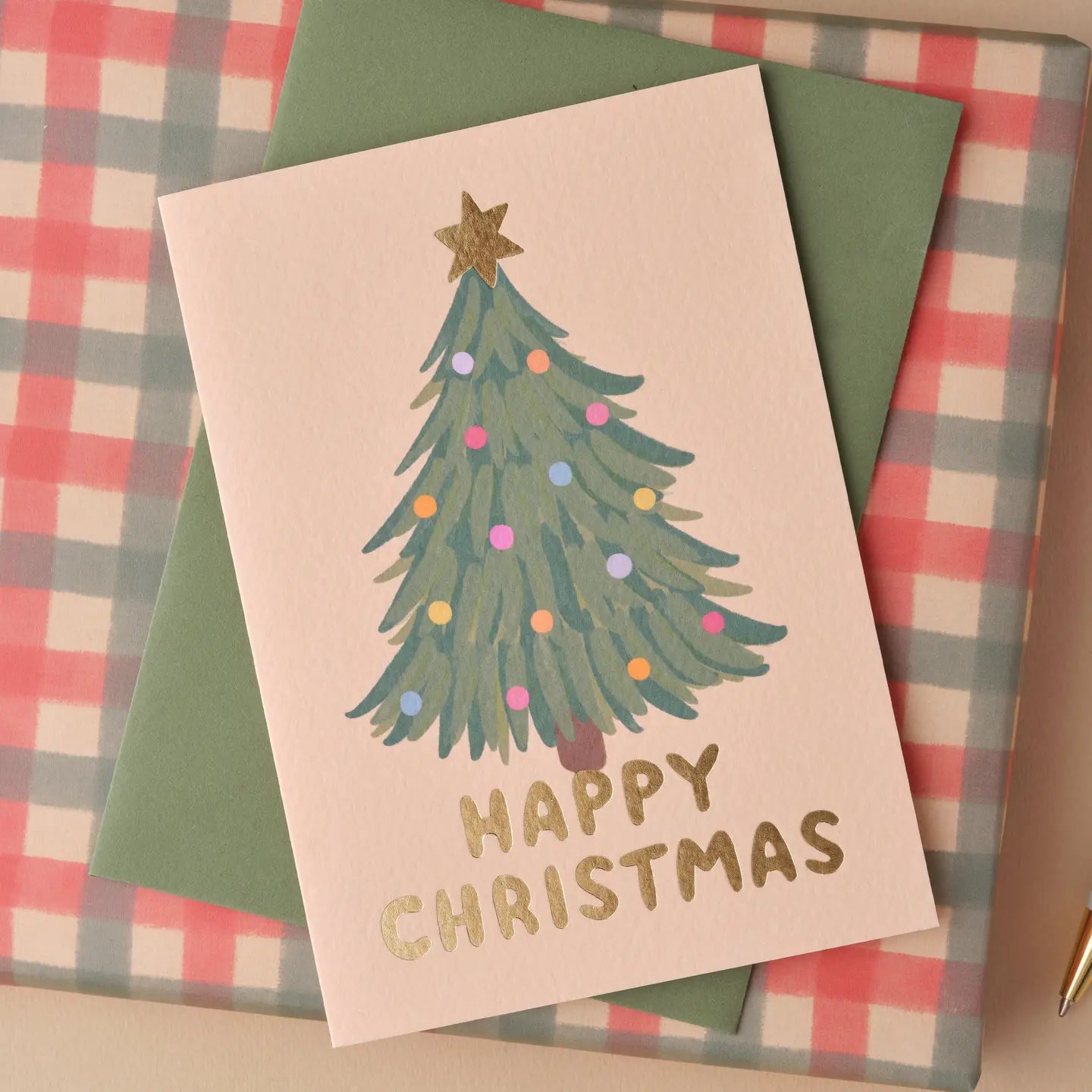 This cheerful Christmas card from Claire Paul is great fun to send! Gold foil card with a Merry Christmas message and an illustration of a Christmas tree.