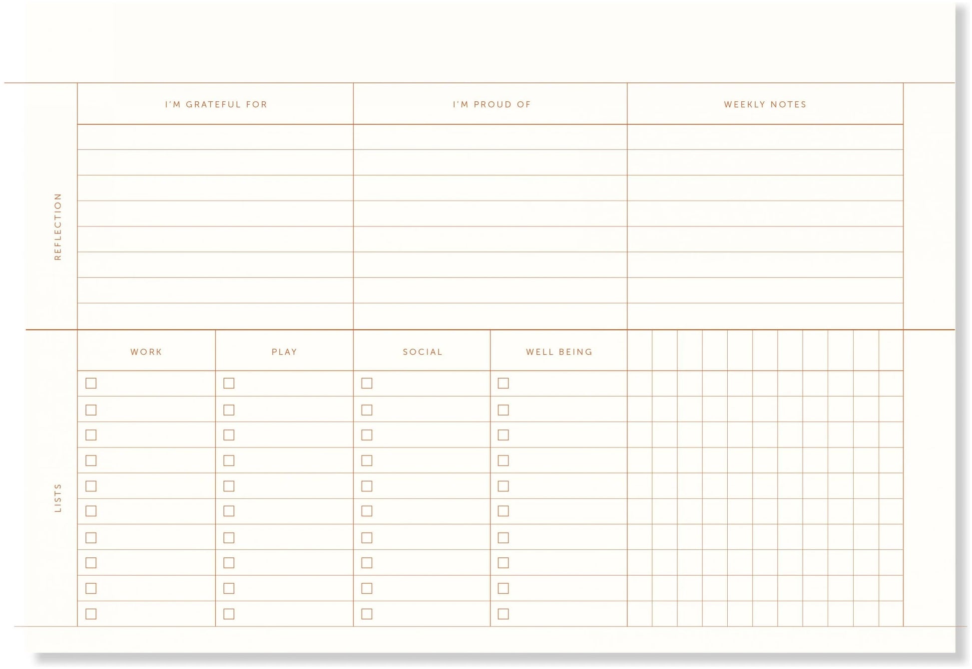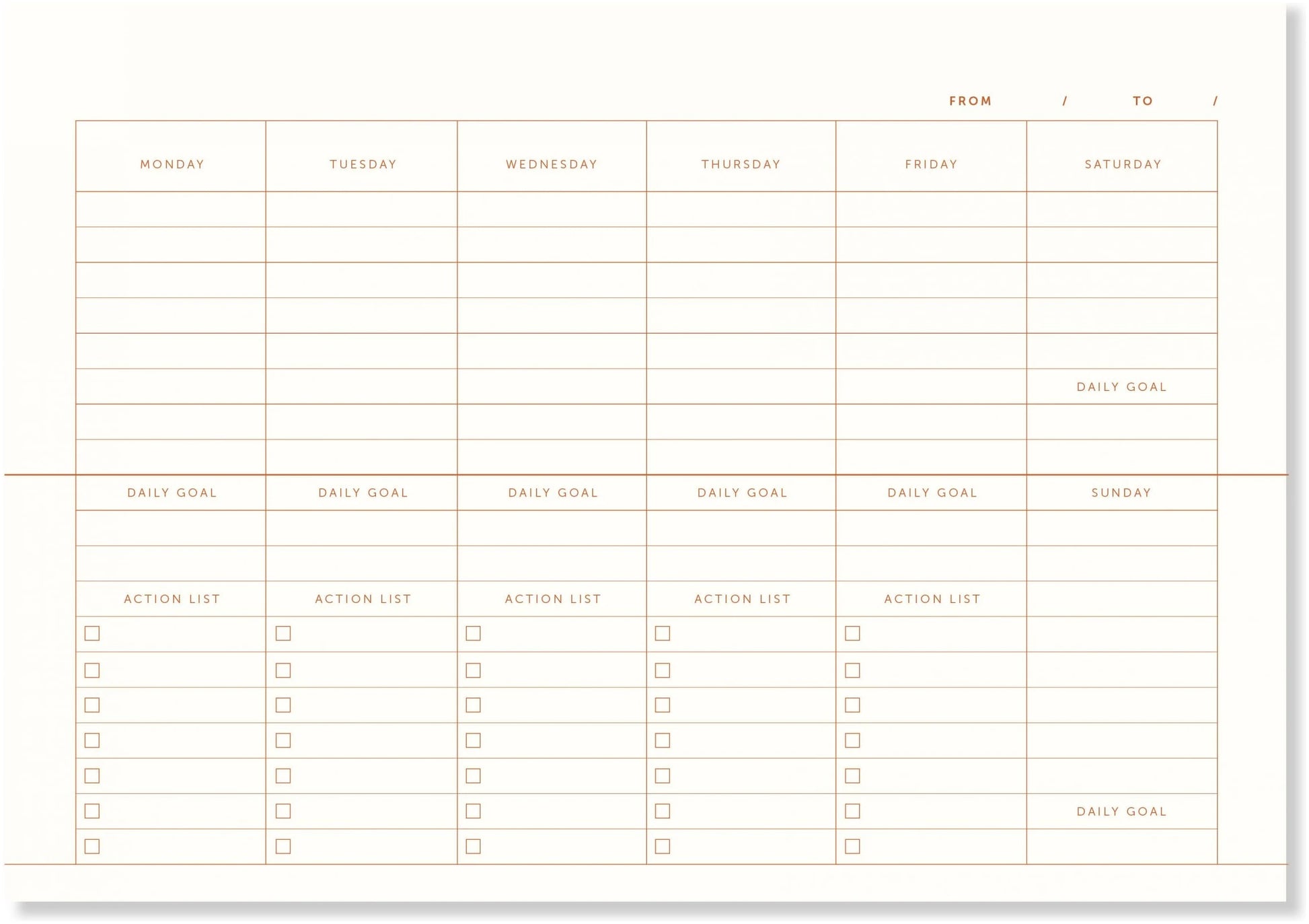 This desk planner is the perfect addition to your stylish interior. The cover is crafted from chic beige linen and features a gold foil print. Inside, you'll find a handy layout with to-do lists and space for your daily goals. Start each week with a clean slate and find everything at a glance on paper.