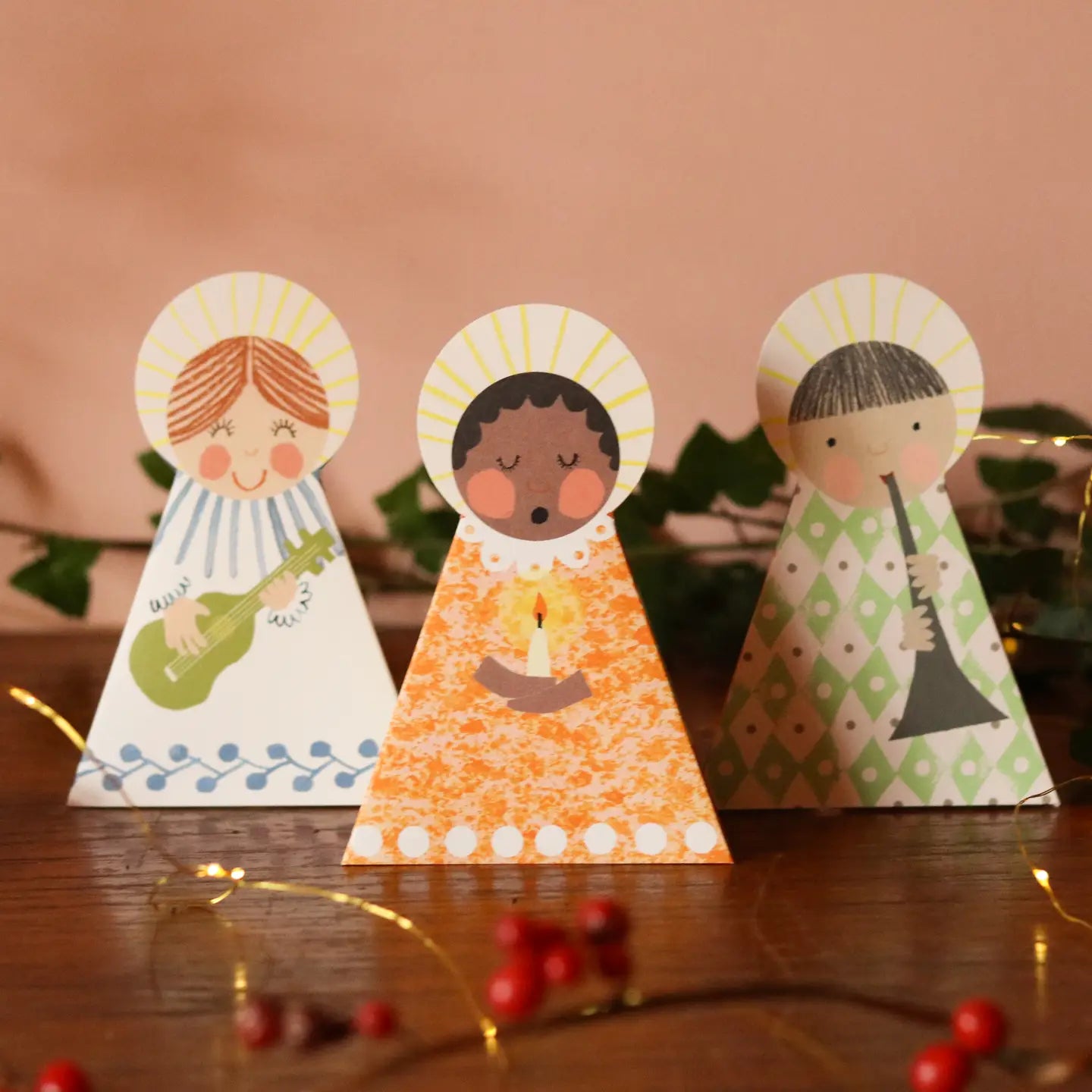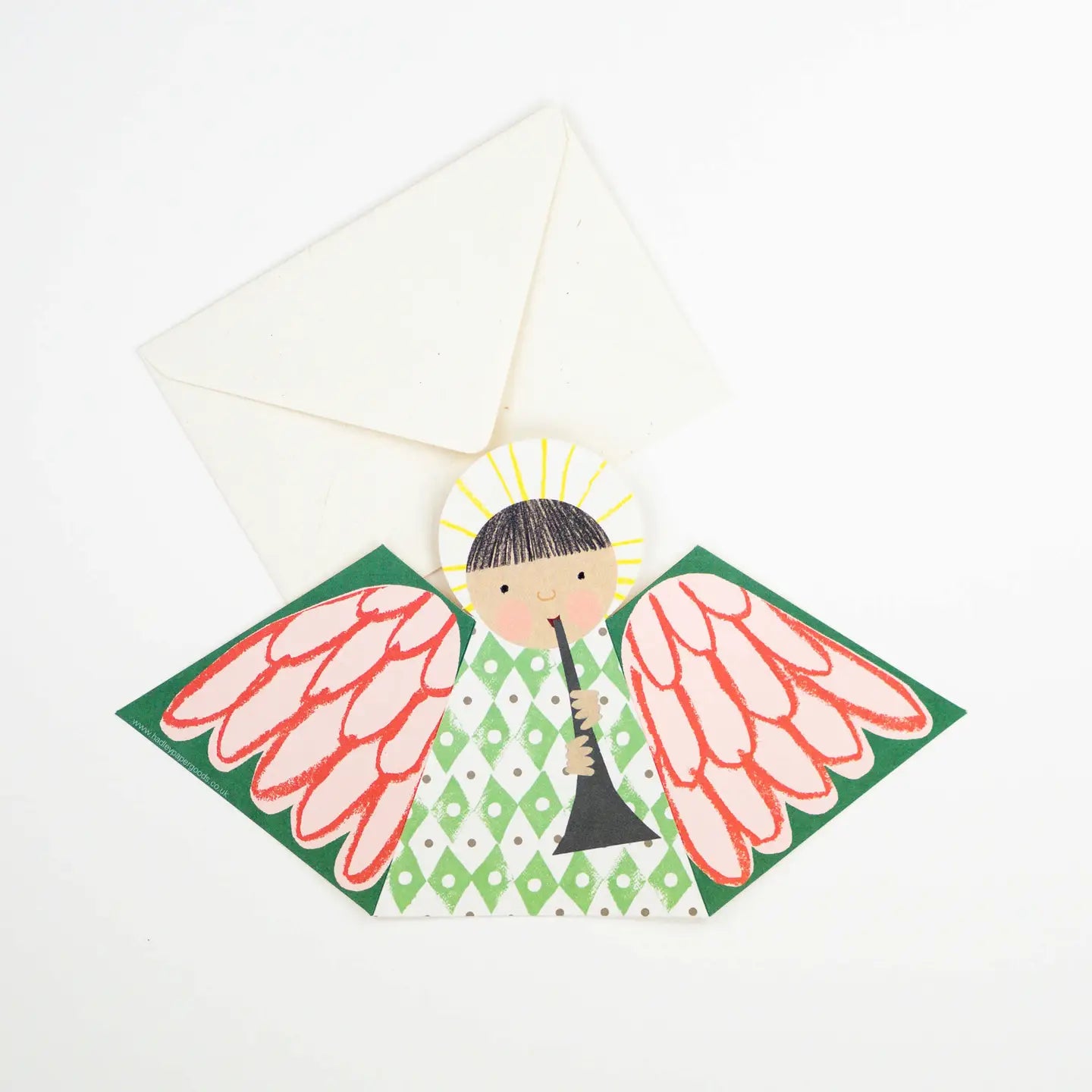 A sweet little angel from a real Christmas choir. This green angel has foldable wings so she's beautifully displayed. Who will you send a lovely festive message to on this unique greeting card?