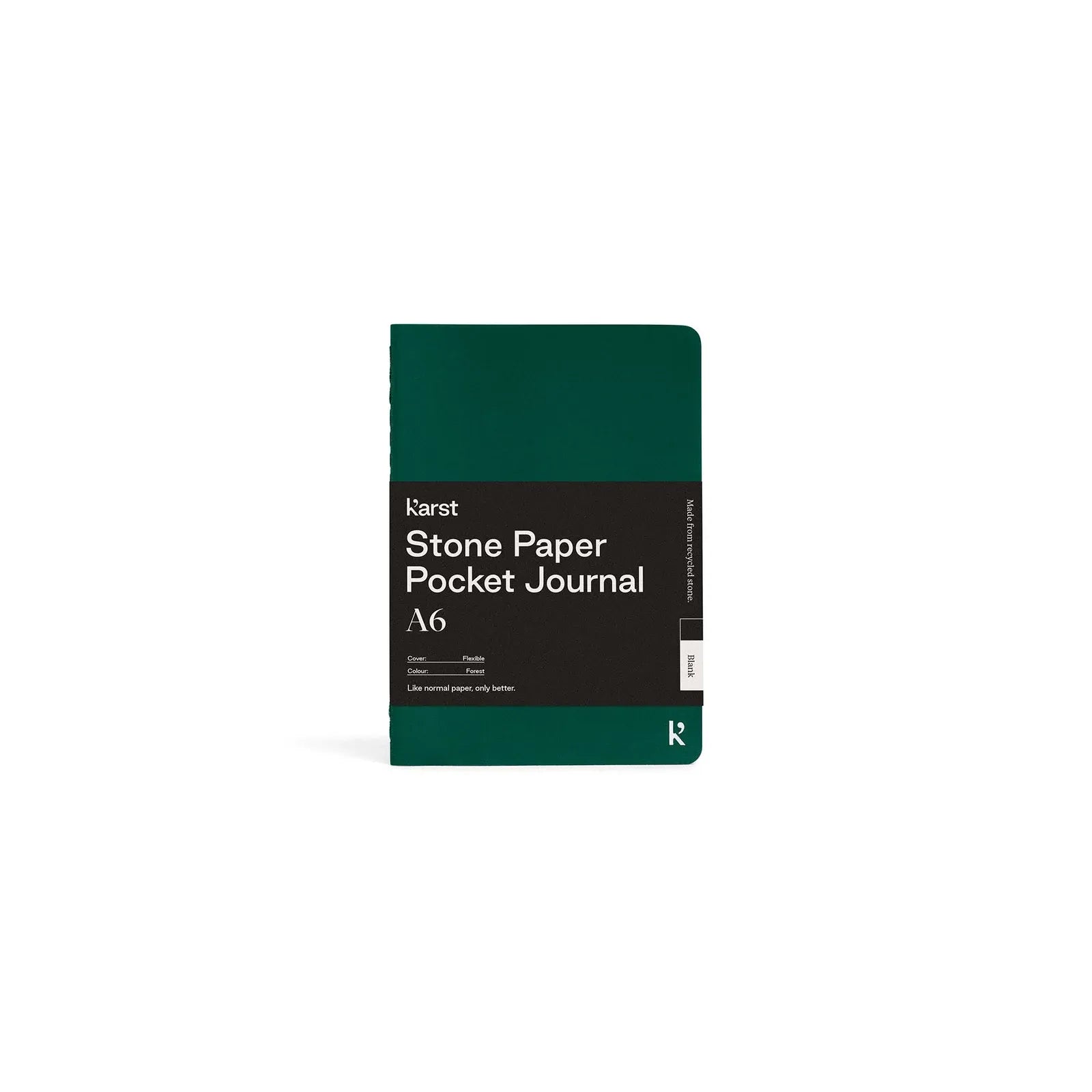 Blank A6 Pocket Journal from Karst in the color Forest. Perfect for when you want to quickly sketch or write an idea while traveling by train. Can be used as a notebook or journal. Made of high quality, durable and recyclable stone paper. Back pocket for loose notes, and always bound with thread. The unique, eco-friendly material is acid-free, bright white and waterproof, with a premium look and feel.