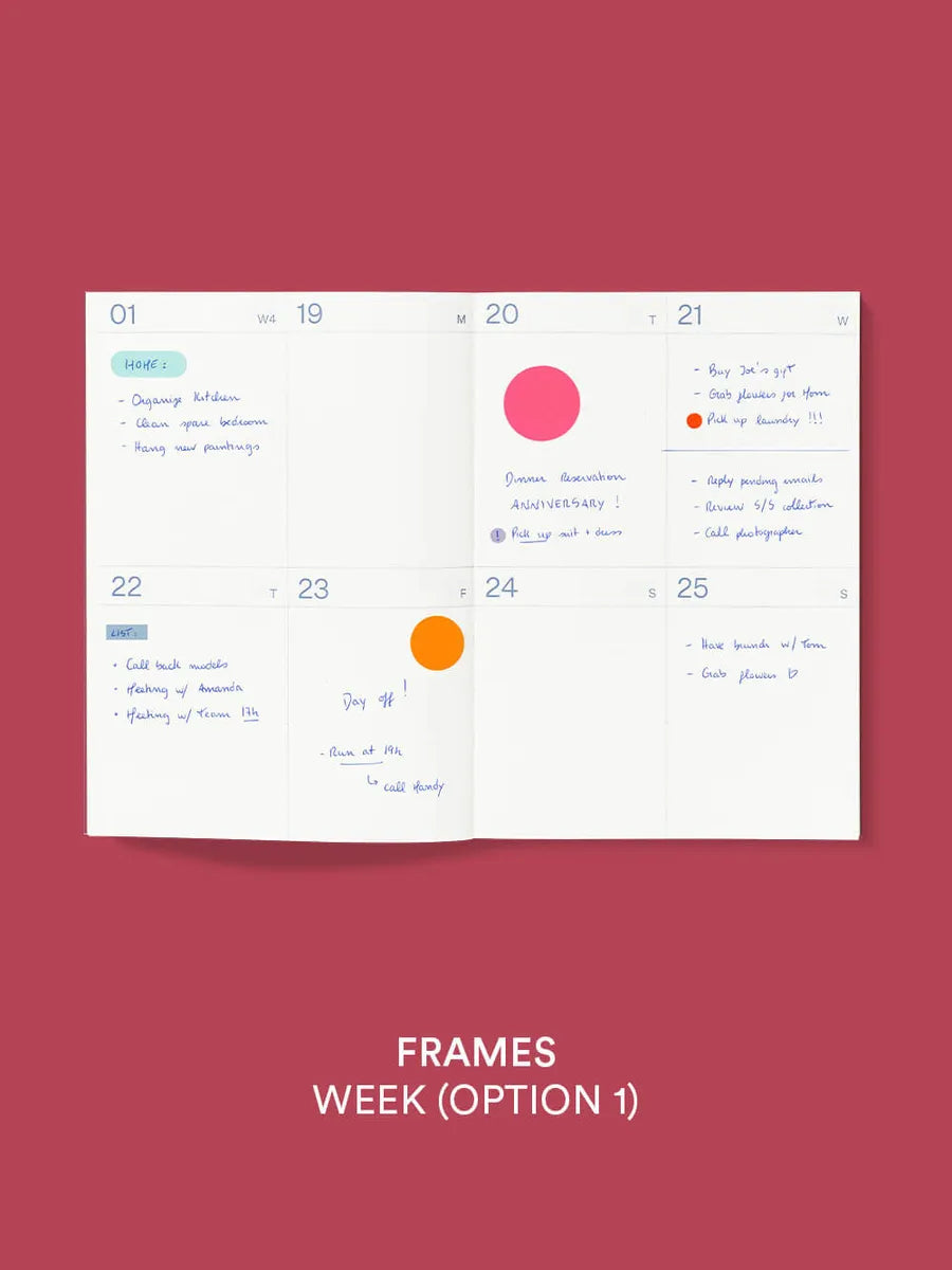 This calendar features the popular ' Frames ' layout, meaning the days of the week are divided into large, spacious areas with plenty of room for all your appointments.