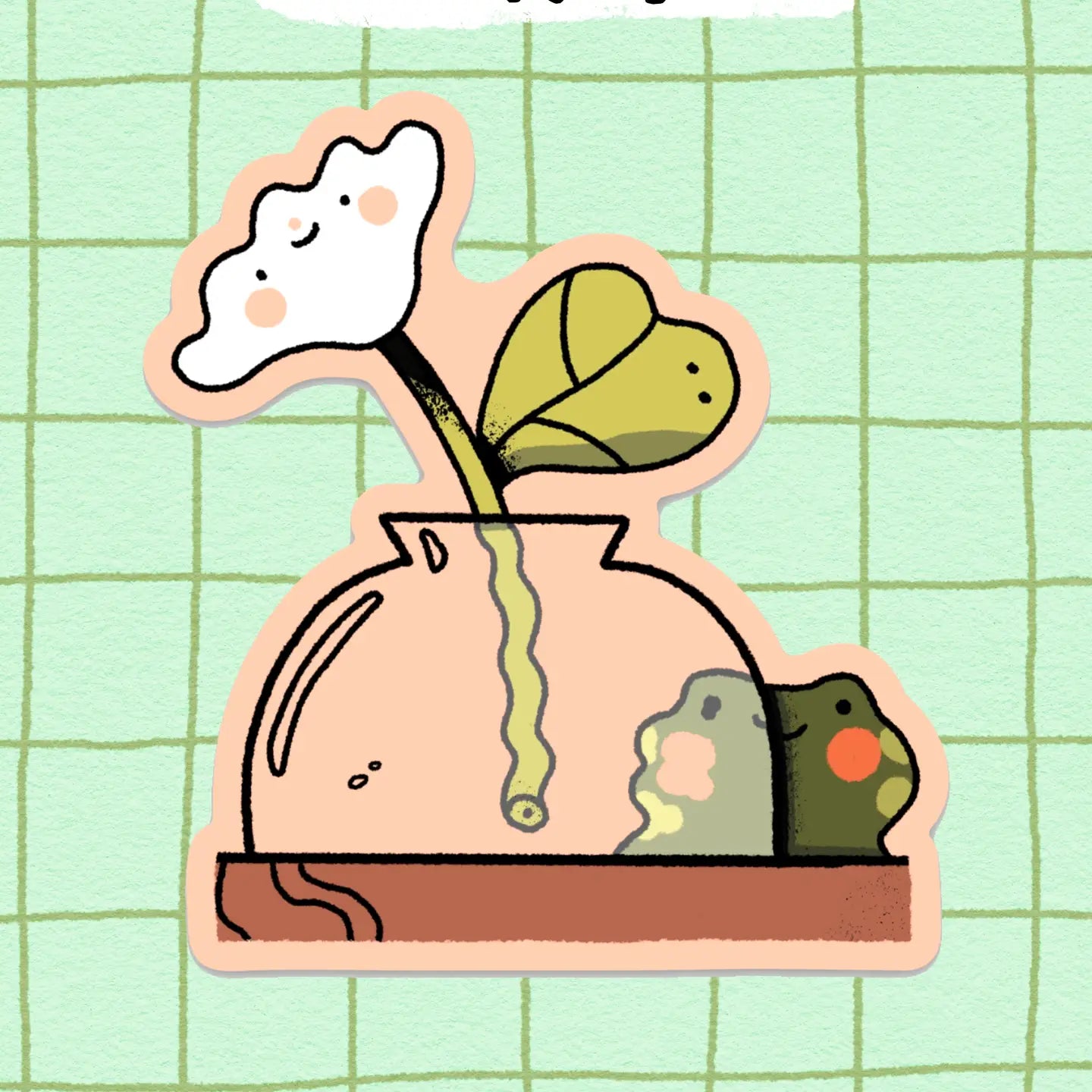 Een verlegen kikker die zich verstopt achter een vrolijke bloem in een charmante vaas. Perfect om je laptop, waterfles, notitieboek of elk glad oppervlak mee te versieren!