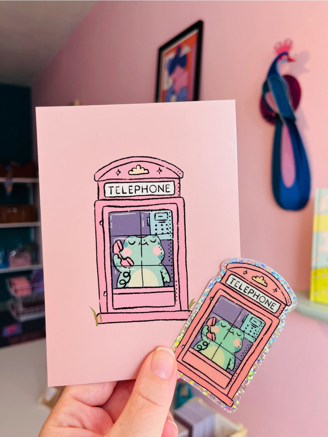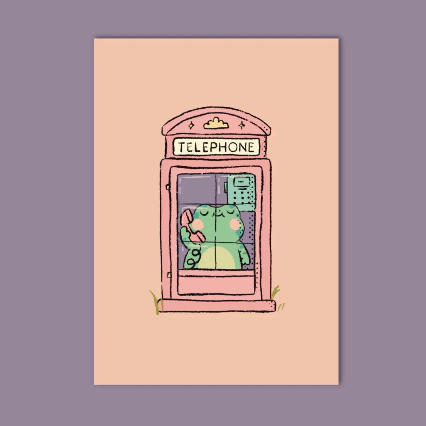 Een lieve telefonerende kikker 📞🐸. Deze A6-ansichtkaart toont een schattig klein kikkertje in een ouderwetse rode telefooncel. Getekend in zachte pasteltinten. Perfect om per post te versturen, aan je muur te hangen of toe te voegen aan je travel journal! De achterkant is ook geïllustreerd met een bijpassend handgetekend ansichtkaartontwerp.