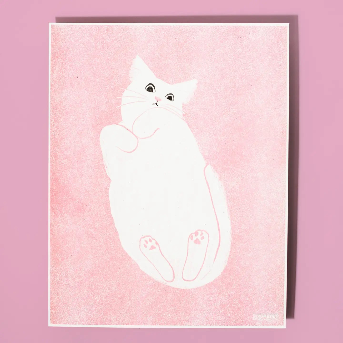 Het perspectief van een kat die op een glazen salontafel ligt te luieren, kleine toebeans tegen het glas gedrukt. Wie wilt dat nou niet vereeuwigd aan de muur hebben? Dit unieke kunstwerk van Bromstad Printing is riso gedrukt in lichtroze, wit en zwart.