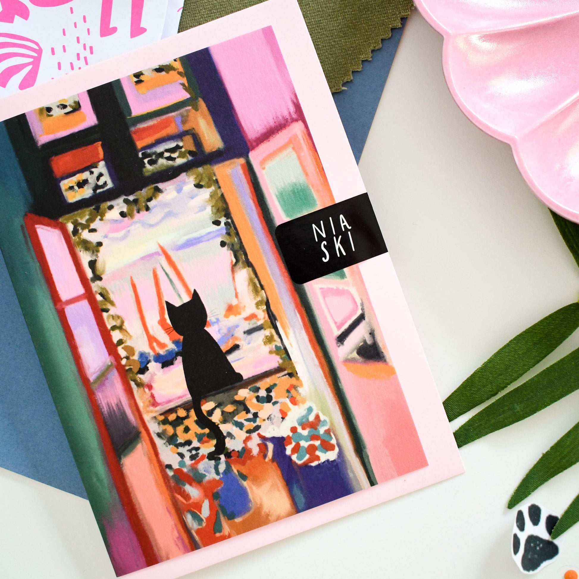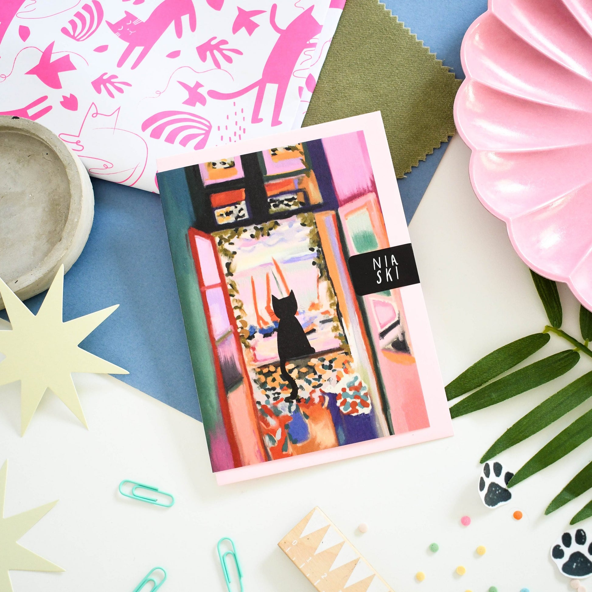 Het kunstwerk van Henri's Mattises 'Open window' maar dan met een kat! Hoe leuk is dat. Een prachtige wenskaart gemaakt door illustrator Nia Gould (Niaski).