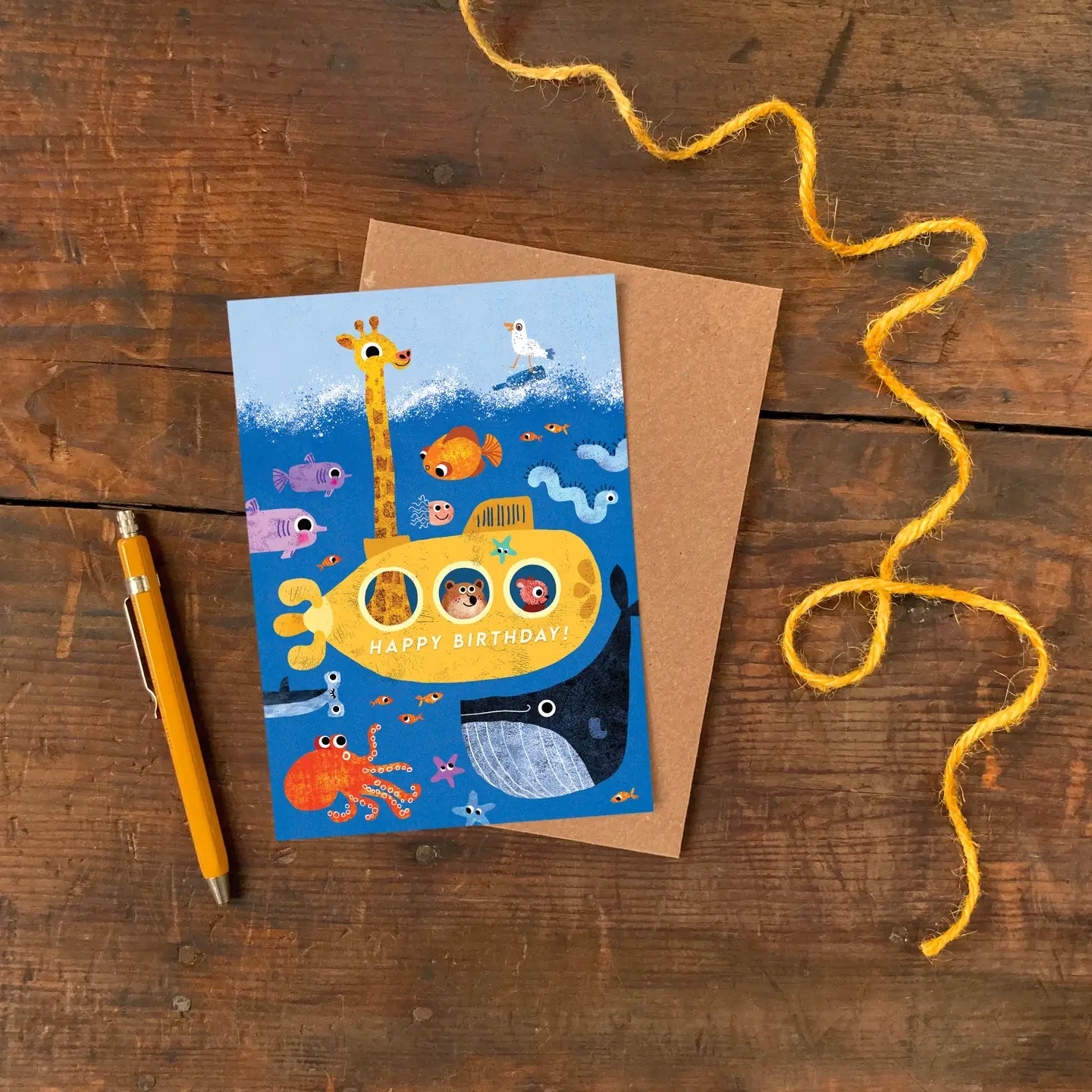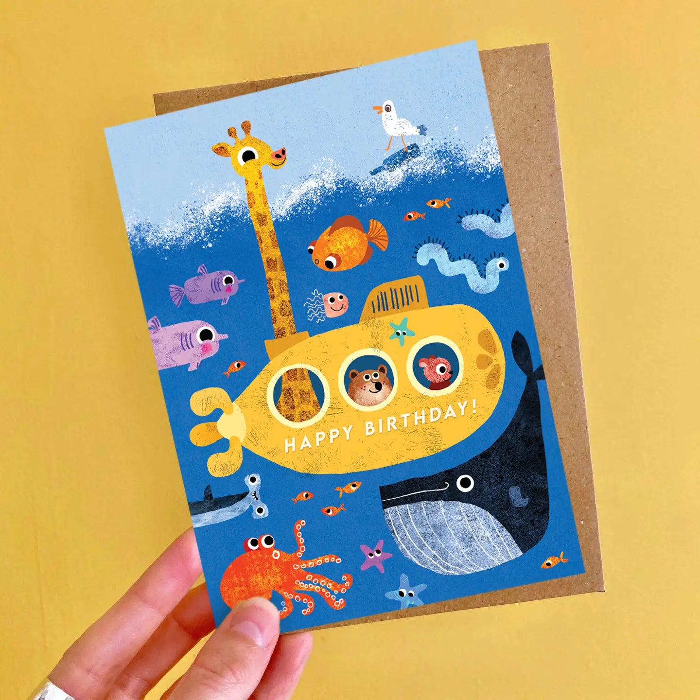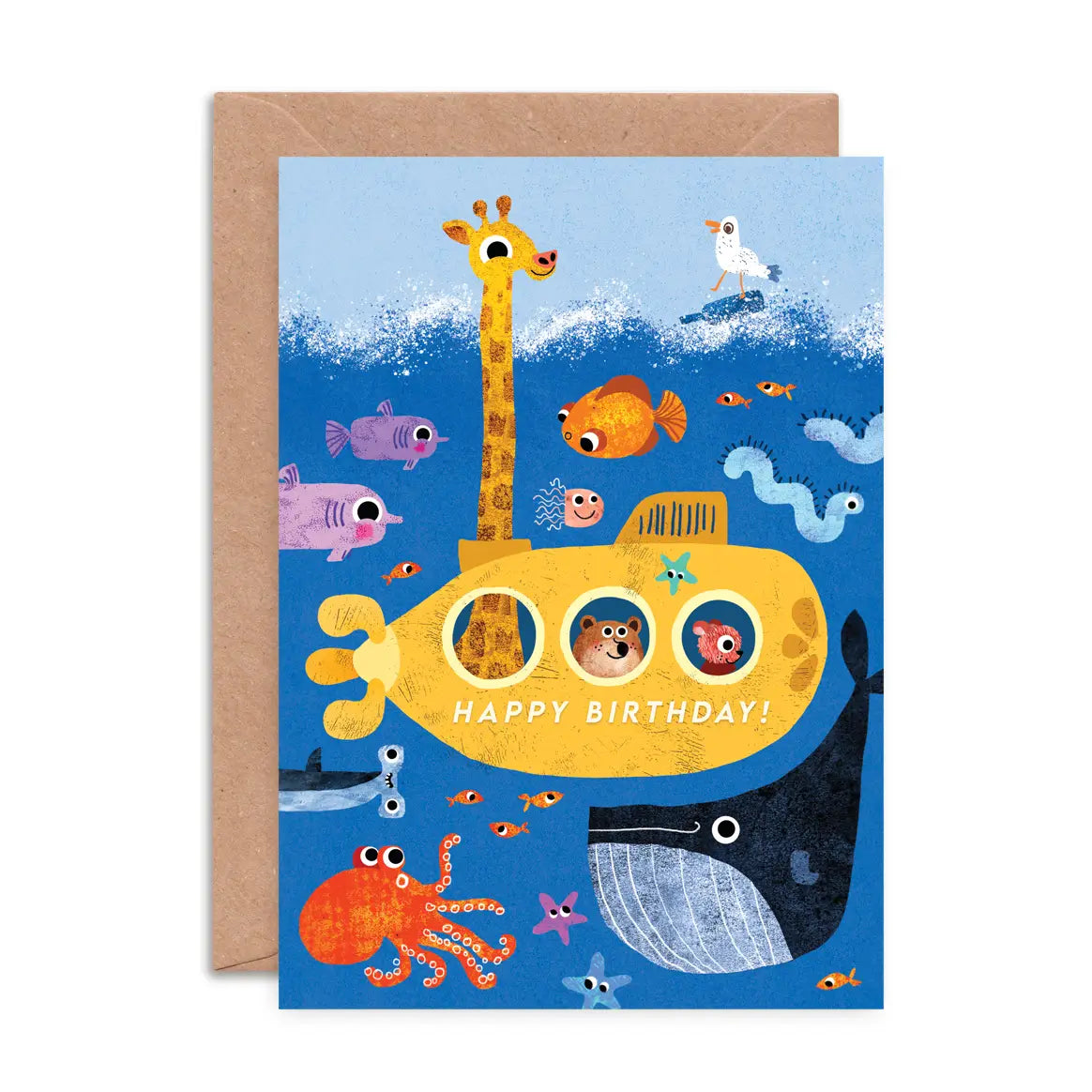 Een vrolijke verjaardagskaart voor kinderen met een heldere en kleurrijke illustratie van een onderzeeër vol met dieren die klaar zijn om een feestje te vieren. Verras een familielid of kennis deze lieve verjaardagskaart.