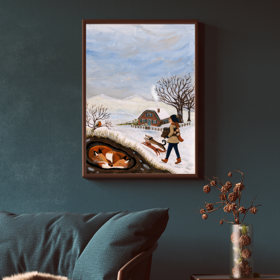 Niets fijner dan een wandeling in de sneeuw én daarna lekker opwarmen bij het vuur! Heerlijk wegdromen met een prachtige print aan je muur.