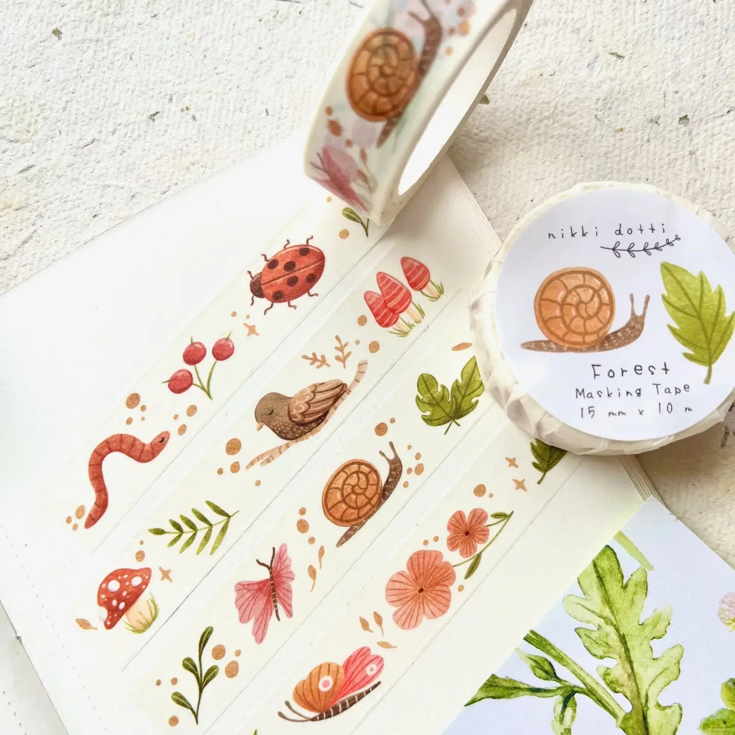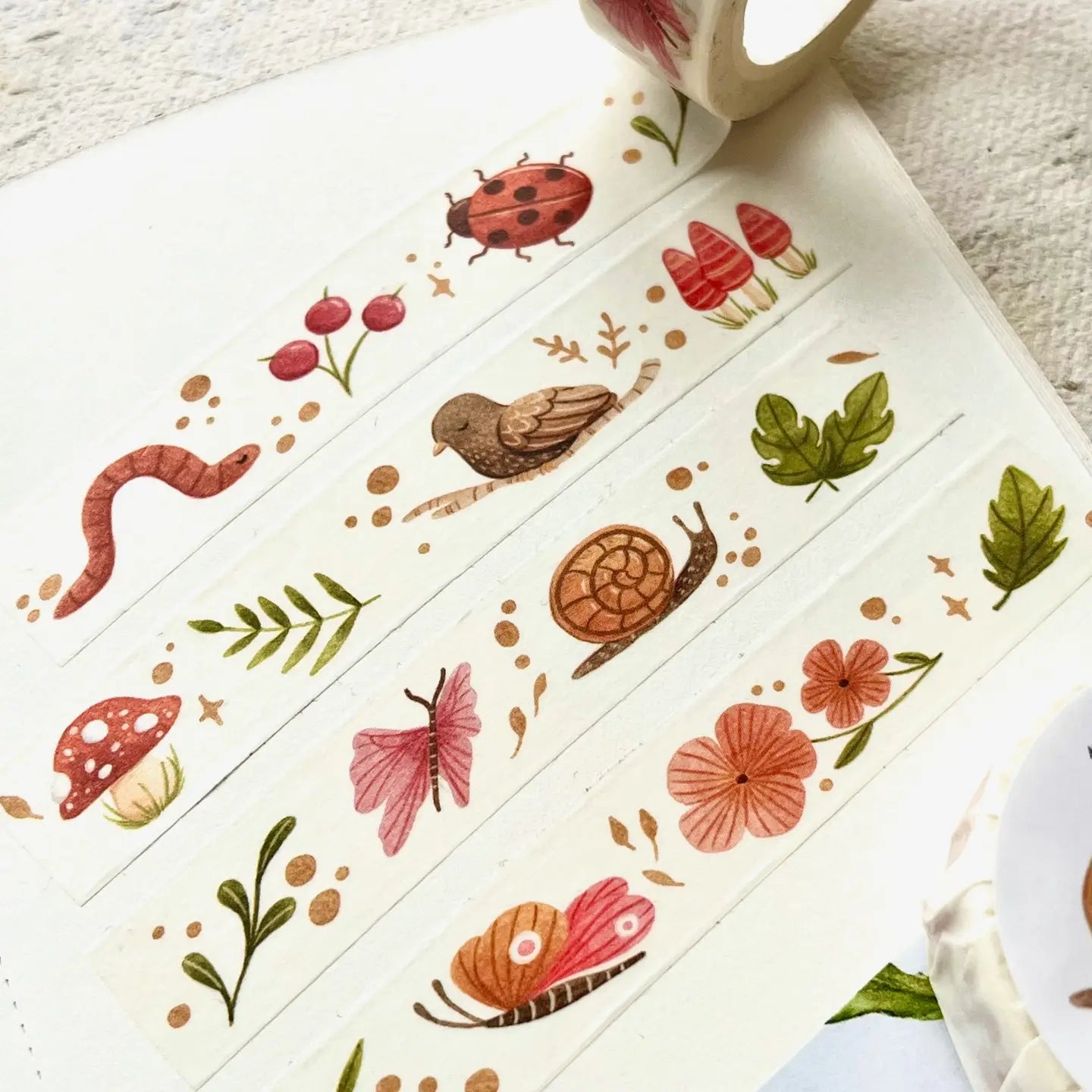 Een schattige washi tape met allerlei dieren en planten uit het bos. Paddestoelen, wormen, vlinders en vrolijke bloemetjes. Leuk voor in je favoriete journal, schetsboek of notitieboek. Waar ga jij 'm op gebruiken?