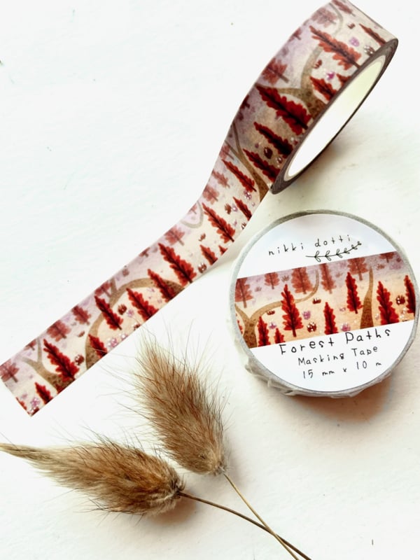 Een mooie washi tape met herfstachtig tafereel. Een wandeling door een rood-oranje kleurend bos. Leuk voor in je planner, schetsboek, travel journal of notitieboek.