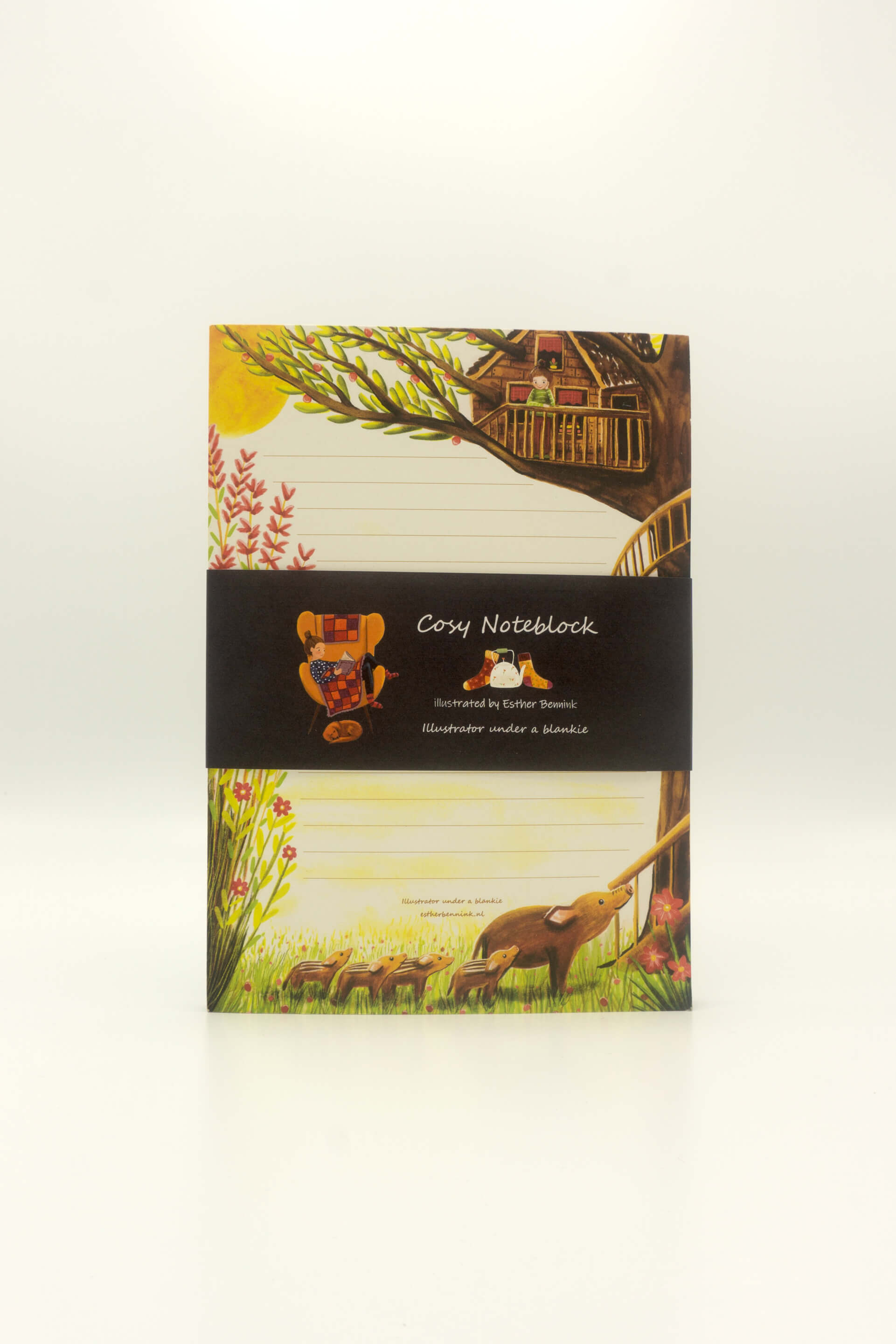 Dit is niet zomaar een notitieblok, op dit notitieblok wíl je schrijven. Een dubbelzijdig bedrukt A5 notitieblok met een super cosy en magische lente illustratie. Een heerlijk blok met schattige diertjes en een mood waar je niet omheen kan.